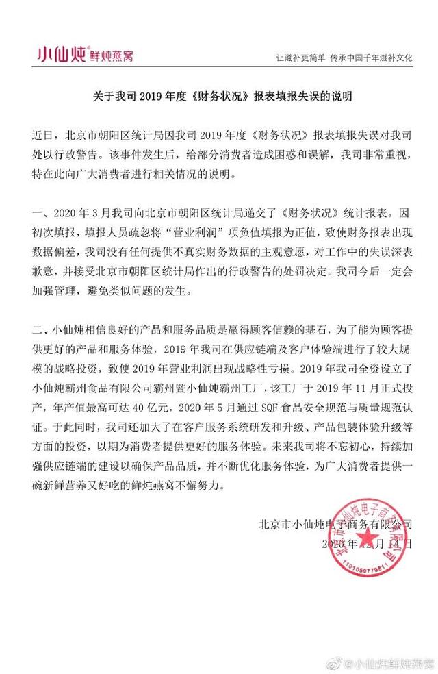 网红燕窝品牌小仙炖最近风波不断。继被指收“智商税”后,12月14日,小仙炖因疑似财务造假再次引发关注。事件的起因是北京朝阳区统计局的一纸行政处罚——小仙炖母公司北京市小仙炖电子商务有限公司因将亏损3293万元写成盈利3293万元,被开出8000元的罚单。...