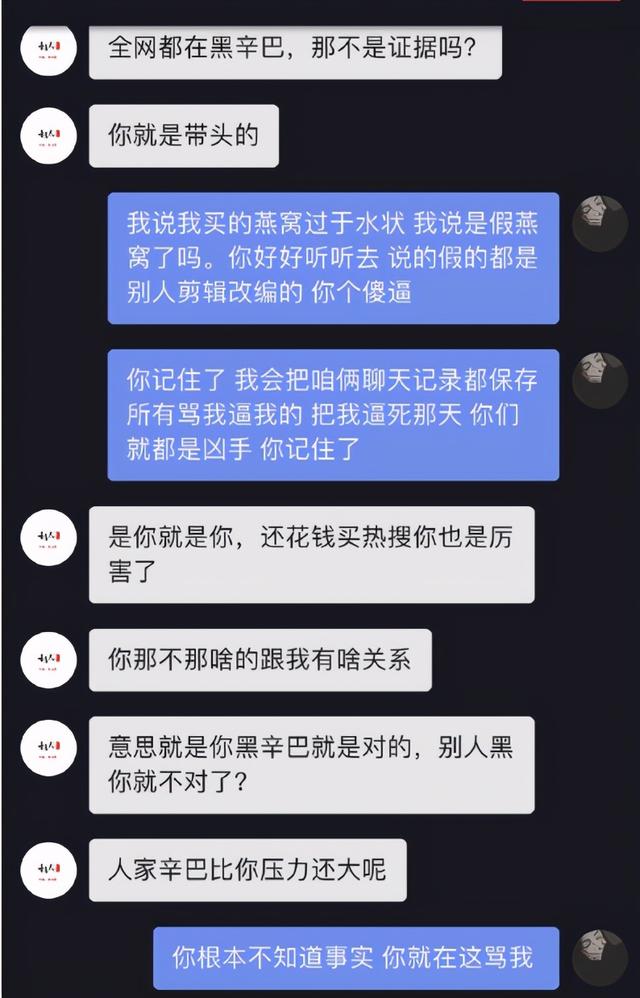 辛巴的老婆初瑞雪也很不服气,在跟某位主播聊天的时候,反驳称,自己家卖的燕窝并不是假货,所以央视发布的帖子是违规的,她称自己已经将律师函发了过去。