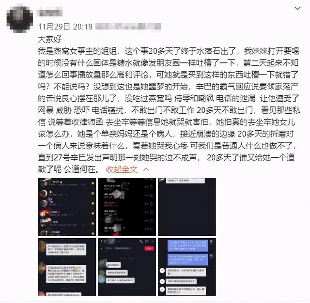 看见那些私信,说等着收律师函,去坐牢等等信息,她就哭就害怕,她怕真的去坐牢,她女儿该怎么办?她是个单亲妈妈,还是个病人,接近崩溃的边缘,20多天的折磨对一个病人来说意味着什么?看着她哭我心疼,可我们是普通人什么也做不了,直到27号辛巴发出声明那一刻她哭的泣不成声, 20多天了,谁又给她一个道歉了呢?公道何在?
