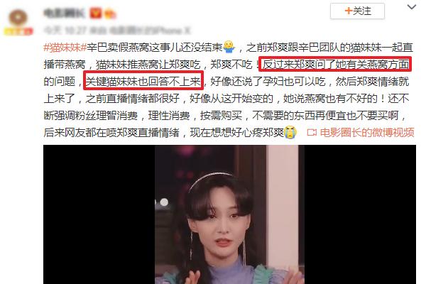 这段对话中解释了当时发飙的原因,其实和辛巴的燕窝也有一定联系,当天直播间内辛巴徒弟猫妹妹就曾推广介绍过燕窝,当时猫妹妹作为帮忙推广的主播对产品也没有什么认知,郑爽连续几次发问燕窝的种类都被忽视,而猫妹妹似乎在躲避回答,直接跳过问题,继续介绍产品。