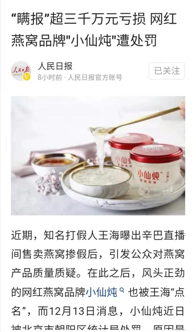 还有就是王海向国家市场监督管理总局举报小仙炖,认为其涉嫌虚假广告。