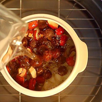 6、龙眼肉干、红枣和雪梨放入炖盅内,注入水,以中火炖40分钟