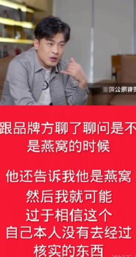 燕窝事件发生后,辛巴打电话与品牌商联系,品牌商还大言不惭告诉他卖的就是燕窝,辛巴也是过于相信品牌商,自己并没有亲自去核实,把品牌商的话当真,辛巴在采访中吐槽这不是一个公司企业领导人该有的态度,也不是一个成年人该有的方式。