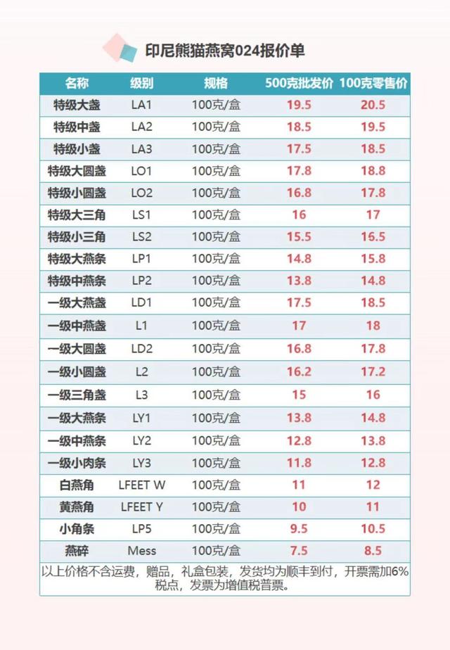 但他透露,在拿货成本上涨之时,零售价上却并没有涨多少,“当年(成本)7元/克的燕窝卖21元/克,而现在14元/克成本的燕窝,零售价只象征性地涨到了22元。”