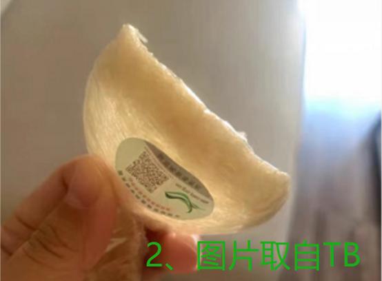 真正不参假的纯天然燕窝,不会特别厚重又密集。像图1图2这种密不透风的,明显是刷胶迹象,人工挑毛痕迹、原来的纹理统统看不见,都被食用胶盖住了,透光性也不好。