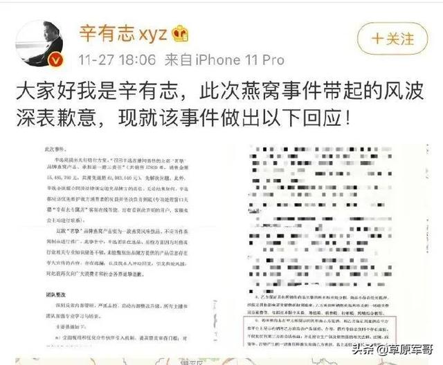 辛巴,就燕窝事件致歉,并提出一赔三的方案