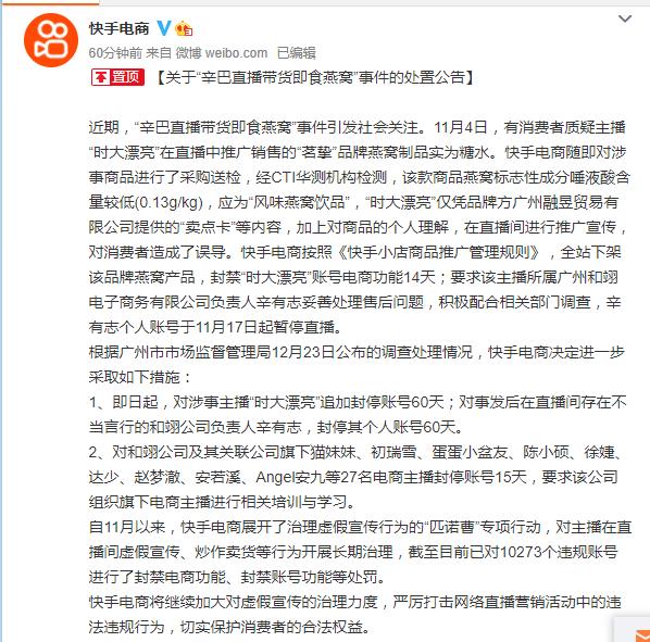 “假燕窝”事件俩公司被罚 快手电商:封停辛有志个人账号60天