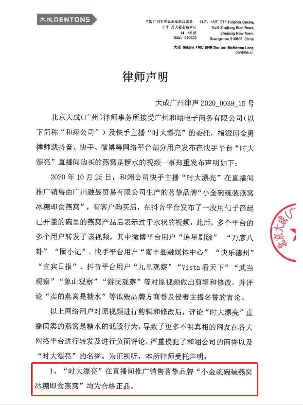 还在律师函里特意指出:“网友所购买的燕窝均为合格正品。”