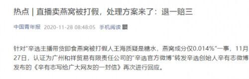 据此前消息,假燕窝事件被曝光后,主播辛有志(网名:辛巴)发布道歉声明,承认此前旗下辛选主播“时大漂亮”直播间所销售的“茗挚”品牌燕窝产品,实为一款燕窝风味饮品,存在夸大宣传的内容,提出先行赔付方案,并承诺将召回辛选直播间所售产品,退一赔三。