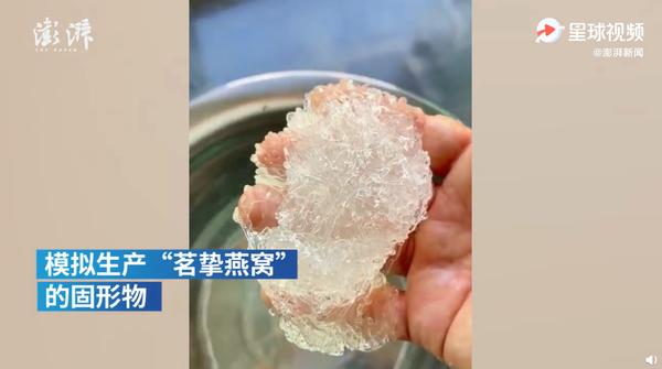为了证实,王海们还曾派人去辛巴的代工厂调查了生产流程,结果发现,整个过程完全不需要添加燕窝,都是“乳酸钙和海藻酸钠化学合成的,再添加一些通过玉米发酵人工合成的唾液酸”,这样在检测时也能检测出唾液酸的成分。在王海发布的视频中,他将乳酸钙溶液和海藻酸钠溶液混合,很快便在水中捞出来了类似燕窝丝一样晶莹剔透的物质。