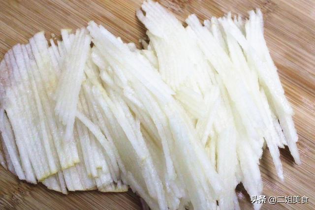 1、首先我们将雪梨清洗干净,然后去掉雪梨的外皮。外皮放进去之后会有硬皮的问题,做这都鲜嫩的素燕窝的话我们一定要去掉雪梨的外皮才可以。我们将雪梨切成薄片之后,然后切成细丝备用,可以切得稍微细一点,这样做出来的雪梨效果更好。如果家里有插板的话,用插板将雪梨插成丝也是可以的,这样做出来的素燕窝的效果会很均匀。