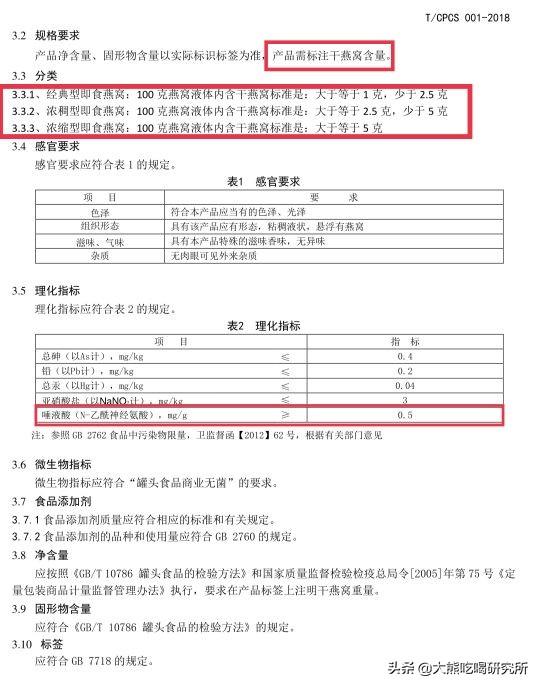 这大概是什么水平呢?我们来看看现有即食燕窝唯一的一个团体标准《T/CPCS 001-2018 即食燕窝》: