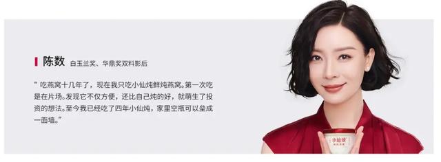 女明星陈数是小仙炖的投资人,她吃的燕窝罐子可以堆满整个房间,且她年逾 40 还不见衰老。这两者本没有必然的联系,但陈数为小仙炖背书的形象足够有说服力,许多年轻消费者特别是女性,已经将燕窝作为美容养颜的神器,尽管知道明星的生活作息与自己不同,变量并非只有燕窝,还是只愿信其有,不愿信其无。