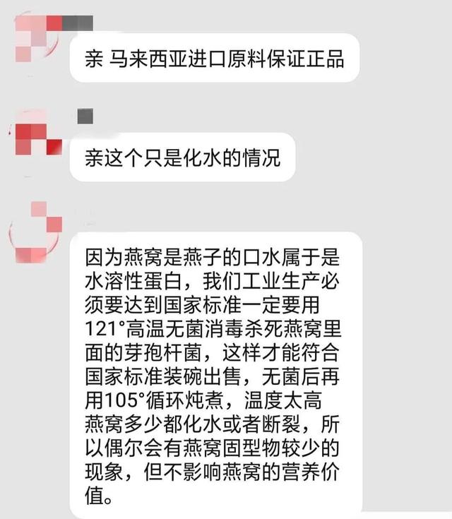 燕窝品牌方回应只是化水现象,并称是马来西亚进口原料保证正品,还进行了专业解释,什么121度高温无菌消毒杀死燕窝里面的芽孢杆菌,什么无菌后用105度循环炖煮,听着就很专业,让人产生信任感。