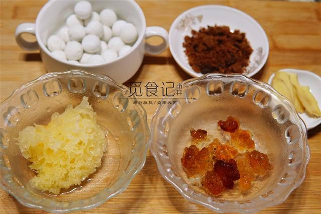 第一步准备食材,桃胶和银耳都是干货,需要充足的泡发时间,一般最好泡上一夜,用手捏一下桃胶中间没有硬块才行,剔除桃胶表面的杂质,银耳泡发备用,生姜切成大概五六片备用,鹌鹑蛋三个煮熟后剥皮备用。