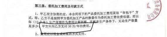 更重要的是,这份委托加工协议漏洞百出。一是2016年签的协议,竟然出现了2017年的企业名称和企业地址。二是既然是委托加工协议,付款方式约定却是无论生产量是多少,只支付30万元的费用。”