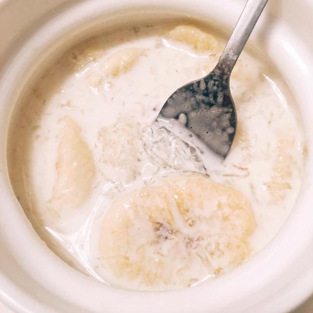 3、将炖燕窝放入碗之中,倒入切好的香蕉、牛奶拌匀即可;