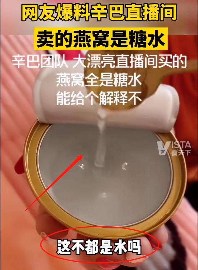 近日,蓝V媒体“Vista看天下”在网上报道称有网友在辛巴直播间买的燕窝,不像燕窝更像是“糖水”,这件事在网上也是引发了不少网友热议。据悉,这款产品是在辛巴团队的网红“时大漂亮”直播间购买的。