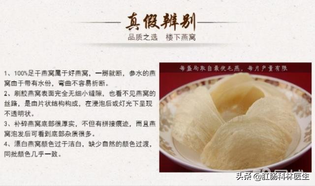 1.尽量选购大品牌燕窝,比如低价的燕窝基本都是合成的,比如该网红售卖的40元/盒燕窝,蛋白质含量竟然为0,从该项看营养价值就不止一个1块钱的土鸡蛋了。