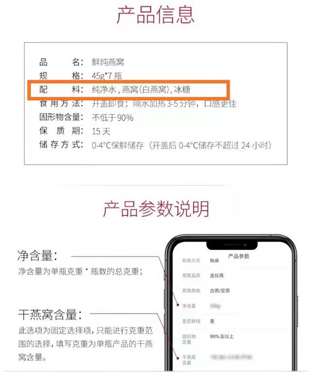 该产品介绍得很有艺术性,只提了产品的重量,但是没有提每瓶之中含有几克干燕窝。这就给了商家较大的活动空间,因此干燕窝越多,意味着自己的成本越高。