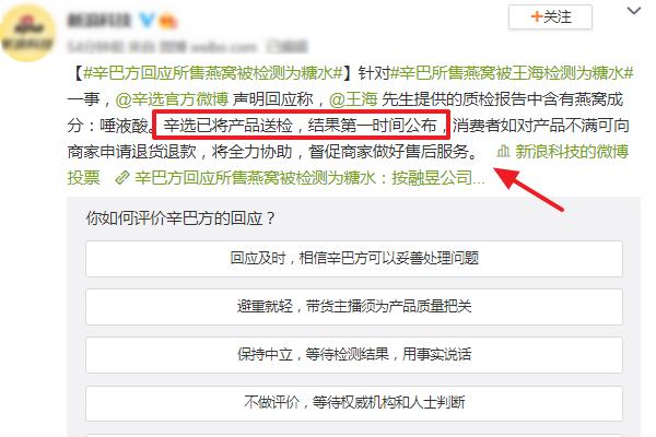 辛巴官方回应所售燕窝被王海检测为糖水:已将产品送检将公布结果