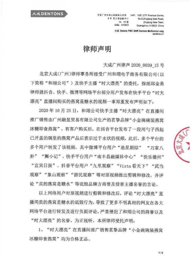 辛巴11月27日发布的声明称,经检测,这款“茗挚”品牌燕窝产品在直播间推广销售时,确实存在夸大宣传,燕窝成分不足每碗2克,根据辛选与广州融昱公司(下文统称“品牌方”签署的《品牌推广合作协议》,明确约定:品牌方必须保证提供给“时大漂亮”展示销售的产品说明、介绍、图片等信息资料不存在虚假、不侵犯任何第三方的合法权益,并且符合生产国及销售国的相关法律、法规、政策等,否则产生的一切责任和损失均由品牌方承担。跟品牌方按照合同规定协调,希望品牌方按照《消费者权益保护法》关于虚假宣传相关法律规定对所有用户进行赔偿。“本应由品牌方与我方共同面对此次事件,但由于品牌方一直回避不见面,沟通不积极,方案不明确,所以我决定主动积极回应解决此次事件。”